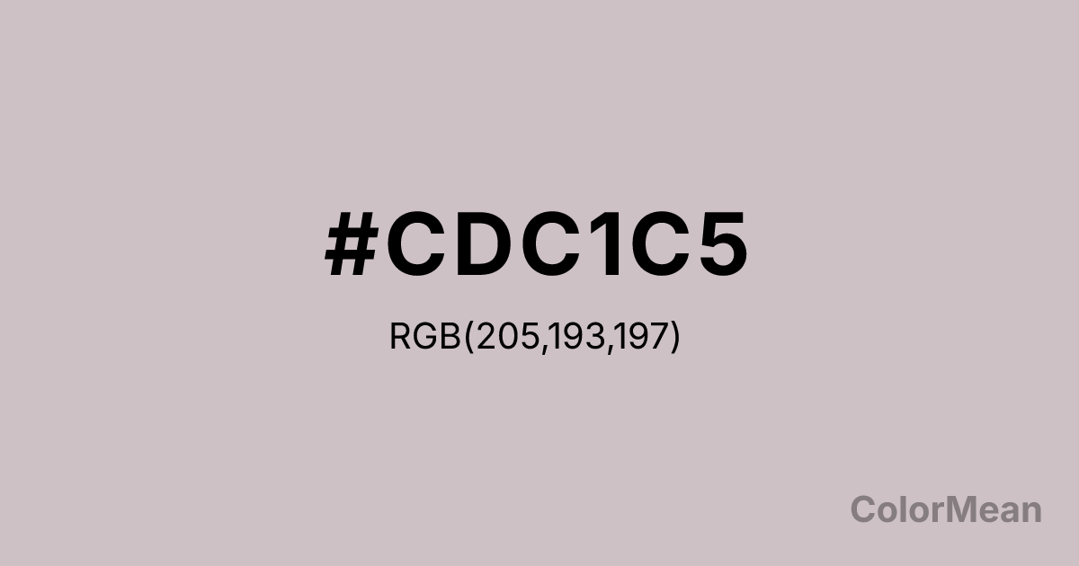 Lavender Blush 3 (#CDC1C5) RGB value is (205, 193, 197). The hex color red value is 205, green is 193, and blue is 197. Its HSL format shows a hue of 340°, saturation of 11 percent, and lightness of 78 percent. The CMYK process values are 0 percent, 6 percent, 4 percent, 20 percent.