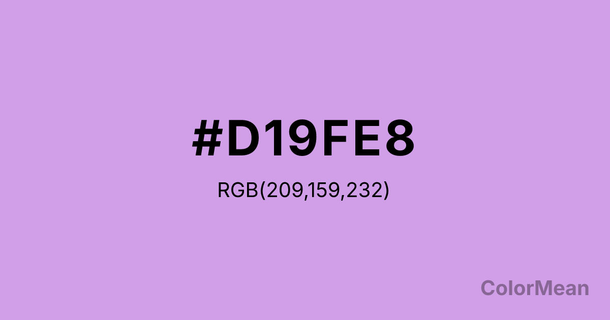 Bright Ube (#D19FE8) RGB value is (209, 159, 232). The hex color red value is 209, green is 159, and blue is 232. Its HSL format shows a hue of 281°, saturation of 61 percent, and lightness of 77 percent. The CMYK process values are 10 percent, 31 percent, 0 percent, 9 percent.