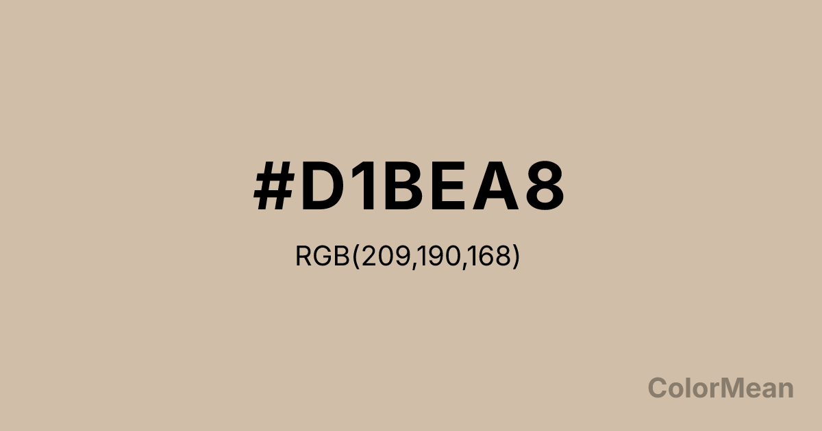 Dark Vanilla (#D1BEA8) RGB value is (209, 190, 168). The hex color red value is 209, green is 190, and blue is 168. Its HSL format shows a hue of 32°, saturation of 31 percent, and lightness of 74 percent. The CMYK process values are 0 percent, 9 percent, 20 percent, 18 percent.