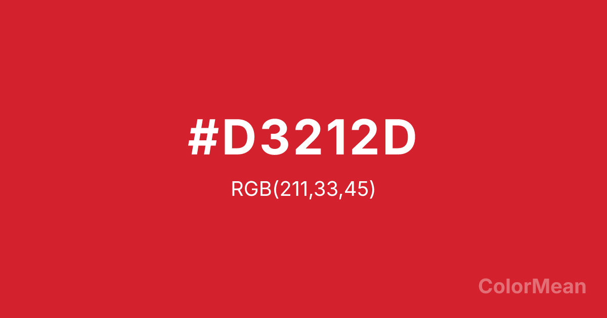 Amaranth Red (#D3212D) RGB value is (211, 33, 45). The hex color red value is 211, green is 33, and blue is 45. Its HSL format shows a hue of 356°, saturation of 73 percent, and lightness of 48 percent. The CMYK process values are 0 percent, 84 percent, 79 percent, 17 percent.