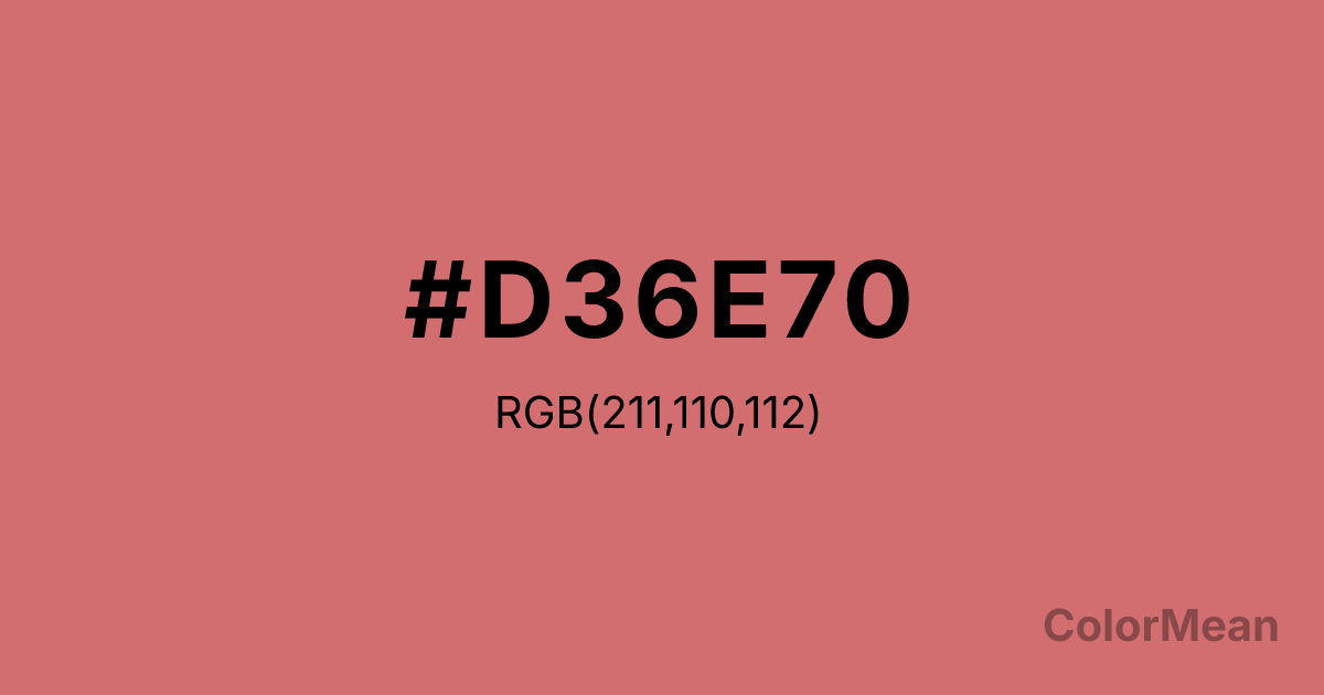 Antique Pink (#D36E70) RGB value is (211, 110, 112). The hex color red value is 211, green is 110, and blue is 112. Its HSL format shows a hue of 359°, saturation of 53 percent, and lightness of 63 percent. The CMYK process values are 0 percent, 48 percent, 47 percent, 17 percent.