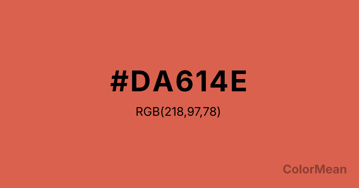 Jelly Bean (#DA614E) RGB value is (218, 97, 78). The hex color red value is 218, green is 97, and blue is 78. Its HSL format shows a hue of 8°, saturation of 65 percent, and lightness of 58 percent. The CMYK process values are 0 percent, 56 percent, 64 percent, 15 percent.