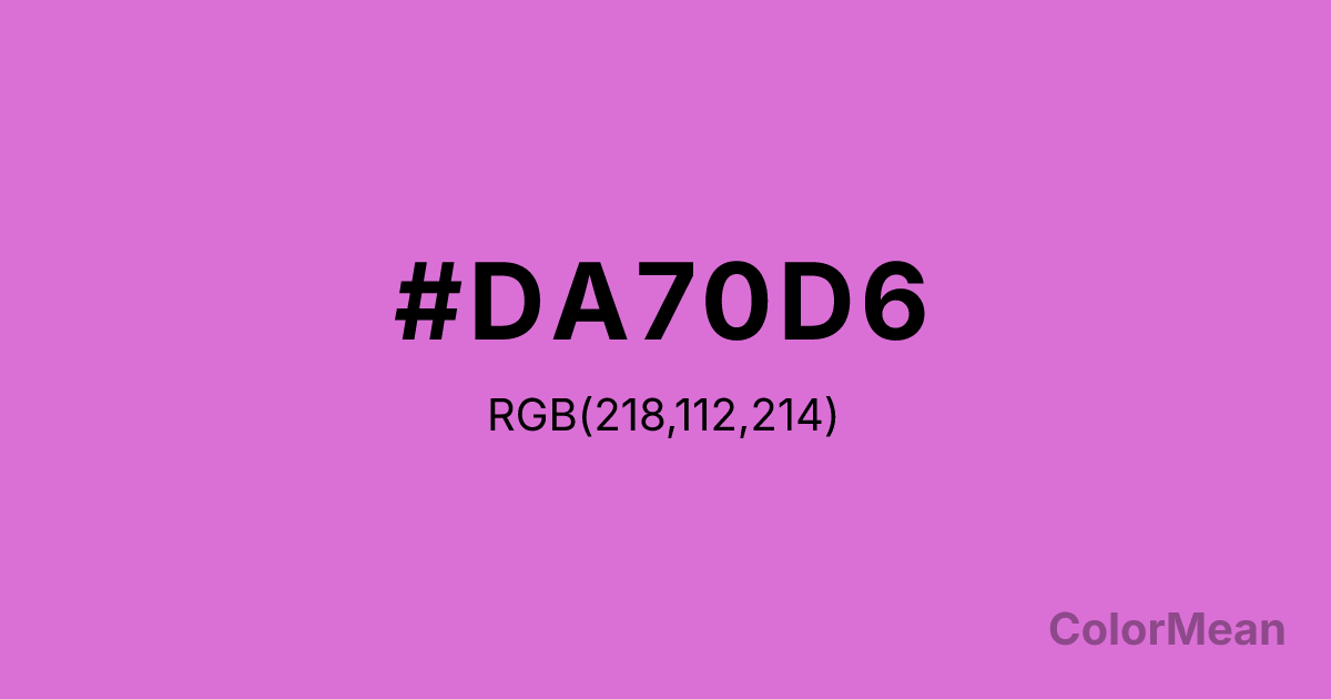 Orchid (#DA70D6) RGB value is (218, 112, 214). The hex color red value is 218, green is 112, and blue is 214. Its HSL format shows a hue of 302°, saturation of 59 percent, and lightness of 65 percent. The CMYK process values are 0 percent, 49 percent, 2 percent, 15 percent.