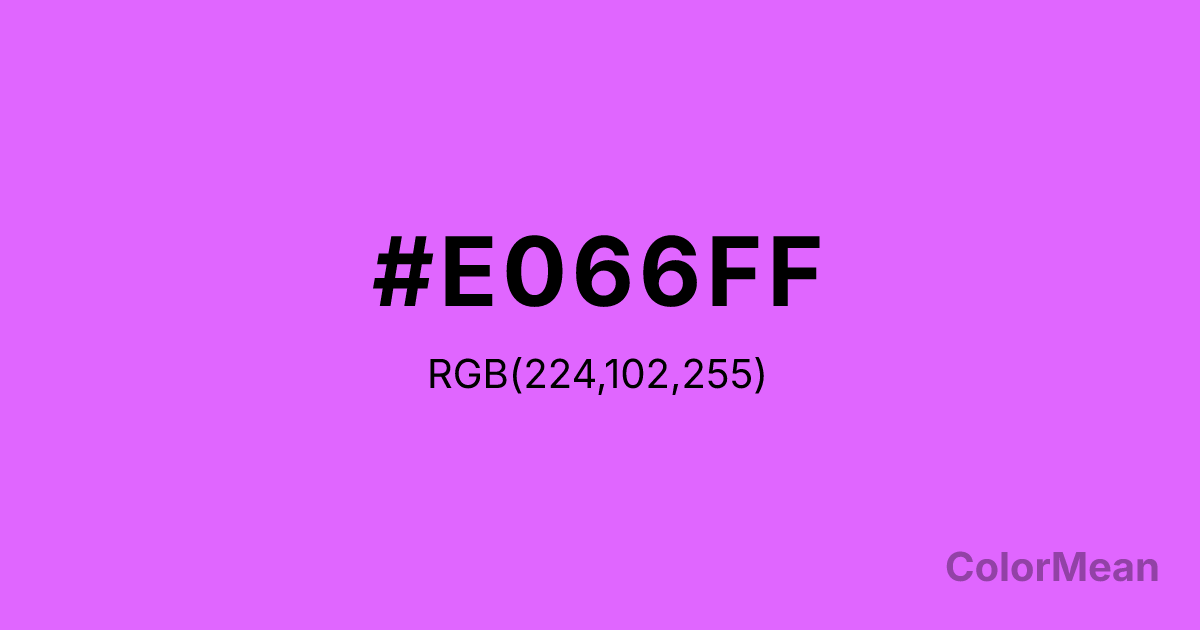 MediumOrchid1 (#E066FF) RGB value is (224, 102, 255). The hex color red value is 224, green is 102, and blue is 255. Its HSL format shows a hue of 288°, saturation of 100 percent, and lightness of 70 percent. The CMYK process values are 12 percent, 60 percent, 0 percent, 0 percent.