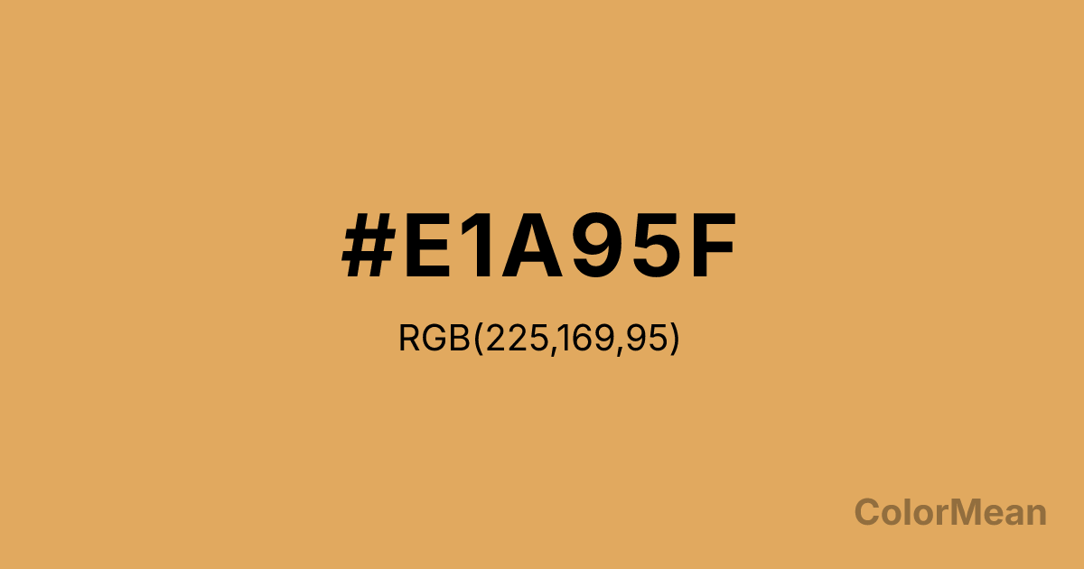 Earth Yellow (#E1A95F) RGB value is (225, 169, 95). The hex color red value is 225, green is 169, and blue is 95. Its HSL format shows a hue of 34°, saturation of 68 percent, and lightness of 63 percent. The CMYK process values are 0 percent, 25 percent, 58 percent, 12 percent.