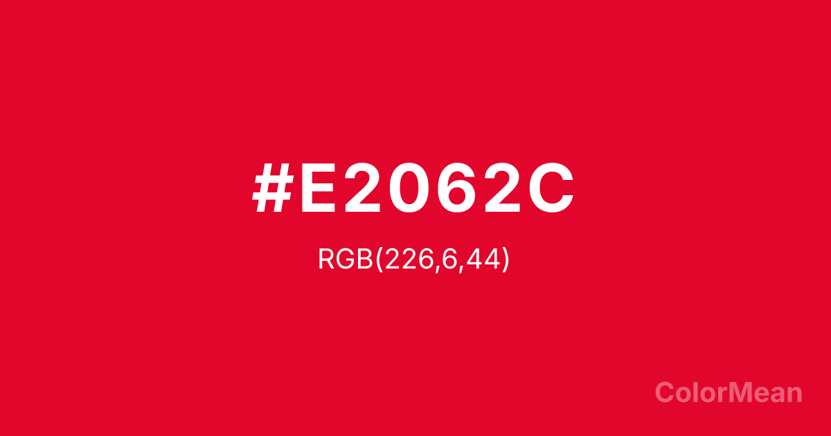 Medium Candy Apple Red (#E2062C) RGB value is (226, 6, 44). The hex color red value is 226, green is 6, and blue is 44. Its HSL format shows a hue of 350°, saturation of 95 percent, and lightness of 45 percent. The CMYK process values are 0 percent, 97 percent, 81 percent, 11 percent.