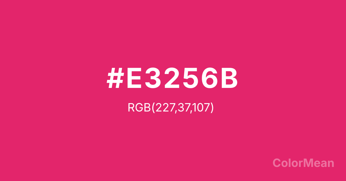 Razzmatazz (#E3256B) RGB value is (227, 37, 107). The hex color red value is 227, green is 37, and blue is 107. Its HSL format shows a hue of 338°, saturation of 77 percent, and lightness of 52 percent. The CMYK process values are 0 percent, 84 percent, 53 percent, 11 percent.