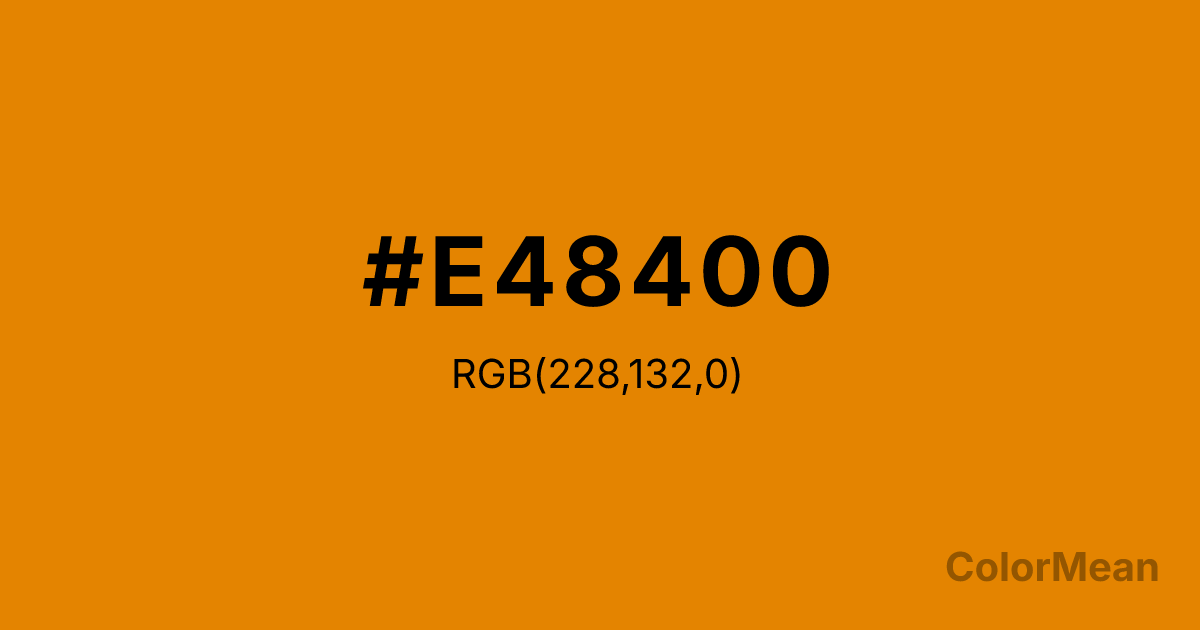 Fulvous (#E48400) RGB value is (228, 132, 0). The hex color red value is 228, green is 132, and blue is 0. Its HSL format shows a hue of 35°, saturation of 100 percent, and lightness of 45 percent. The CMYK process values are 0 percent, 42 percent, 100 percent, 11 percent.