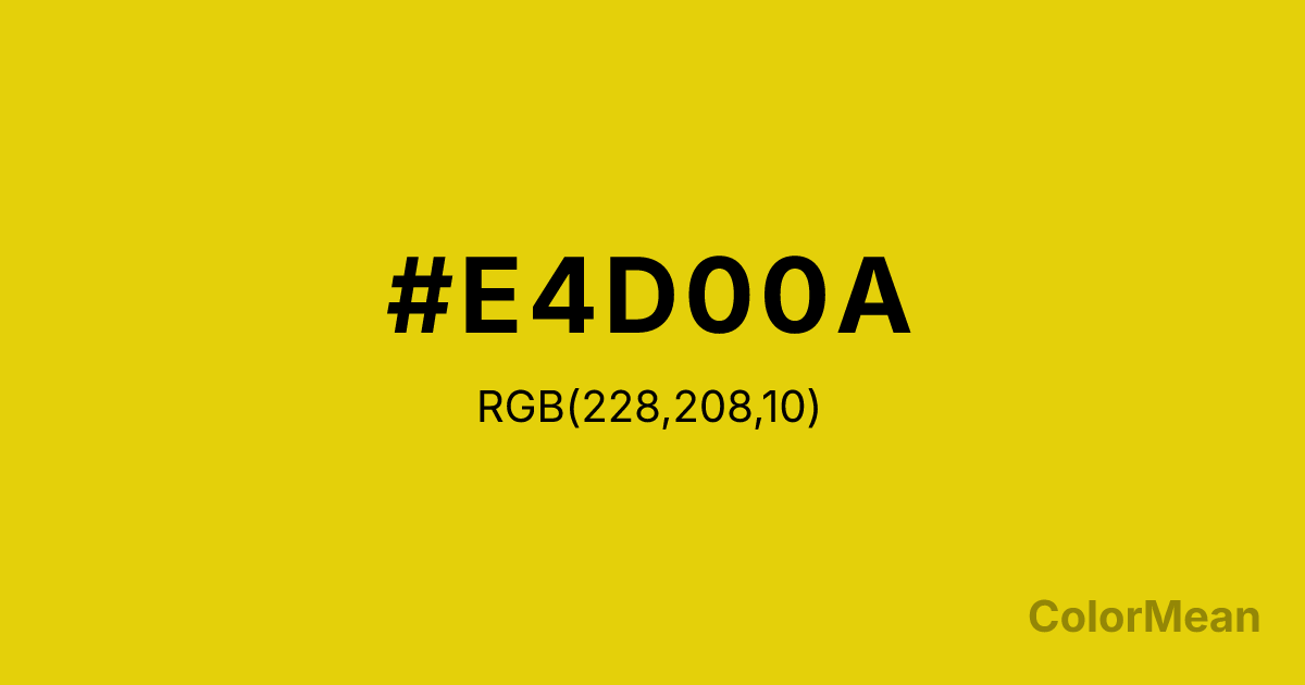 Citrine (#E4D00A) RGB value is (228, 208, 10). The hex color red value is 228, green is 208, and blue is 10. Its HSL format shows a hue of 54°, saturation of 92 percent, and lightness of 47 percent. The CMYK process values are 0 percent, 9 percent, 96 percent, 11 percent.