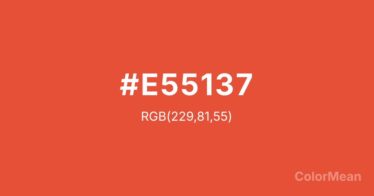 Salmon Range (#E55137) RGB value is (229, 81, 55). The hex color red value is 229, green is 81, and blue is 55. Its HSL format shows a hue of 9°, saturation of 77 percent, and lightness of 56 percent. The CMYK process values are 0 percent, 65 percent, 76 percent, 10 percent.