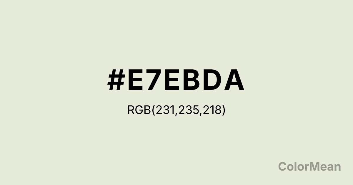 Grey White (#E7EBDA) RGB value is (231, 235, 218). The hex color red value is 231, green is 235, and blue is 218. Its HSL format shows a hue of 74°, saturation of 30 percent, and lightness of 89 percent. The CMYK process values are 2 percent, 0 percent, 7 percent, 8 percent.