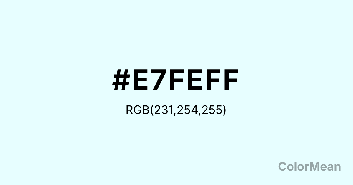 Bubbles (#E7FEFF) RGB value is (231, 254, 255). The hex color red value is 231, green is 254, and blue is 255. Its HSL format shows a hue of 183°, saturation of 100 percent, and lightness of 95 percent. The CMYK process values are 9 percent, 0 percent, 0 percent, 0 percent.