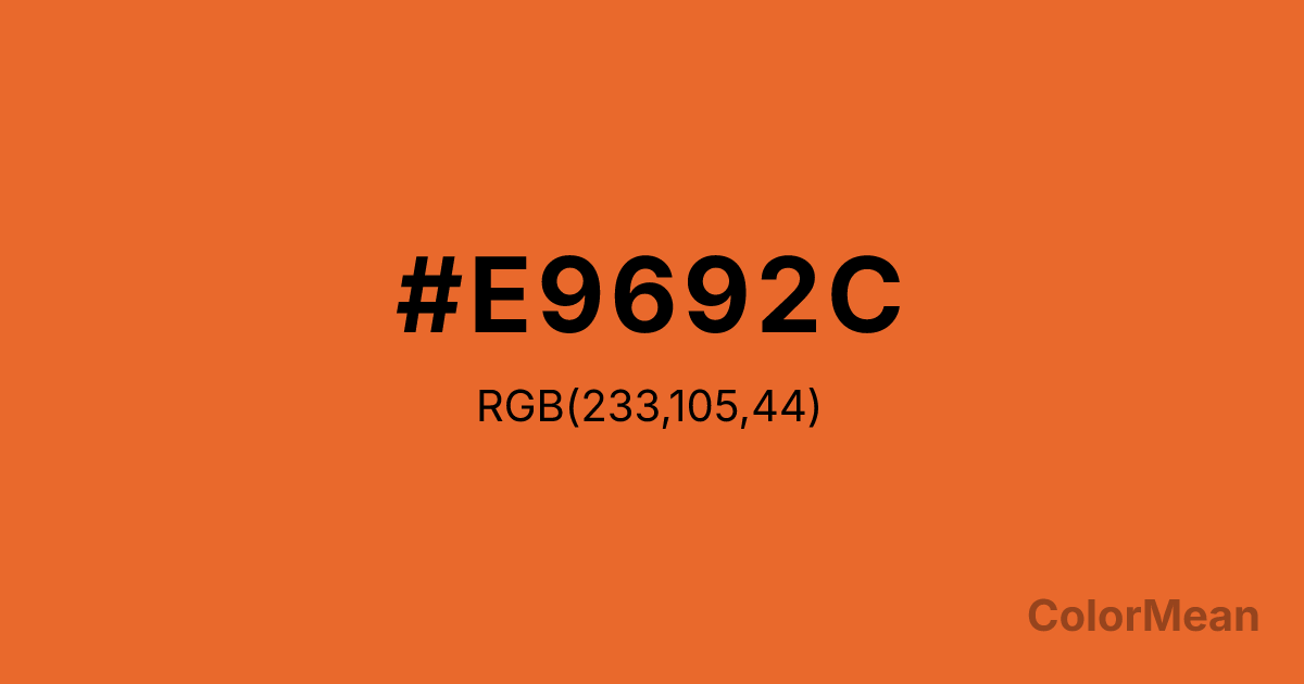 Deep Carrot Orange (#E9692C) RGB value is (233, 105, 44). The hex color red value is 233, green is 105, and blue is 44. Its HSL format shows a hue of 19°, saturation of 81 percent, and lightness of 54 percent. The CMYK process values are 0 percent, 55 percent, 81 percent, 9 percent.