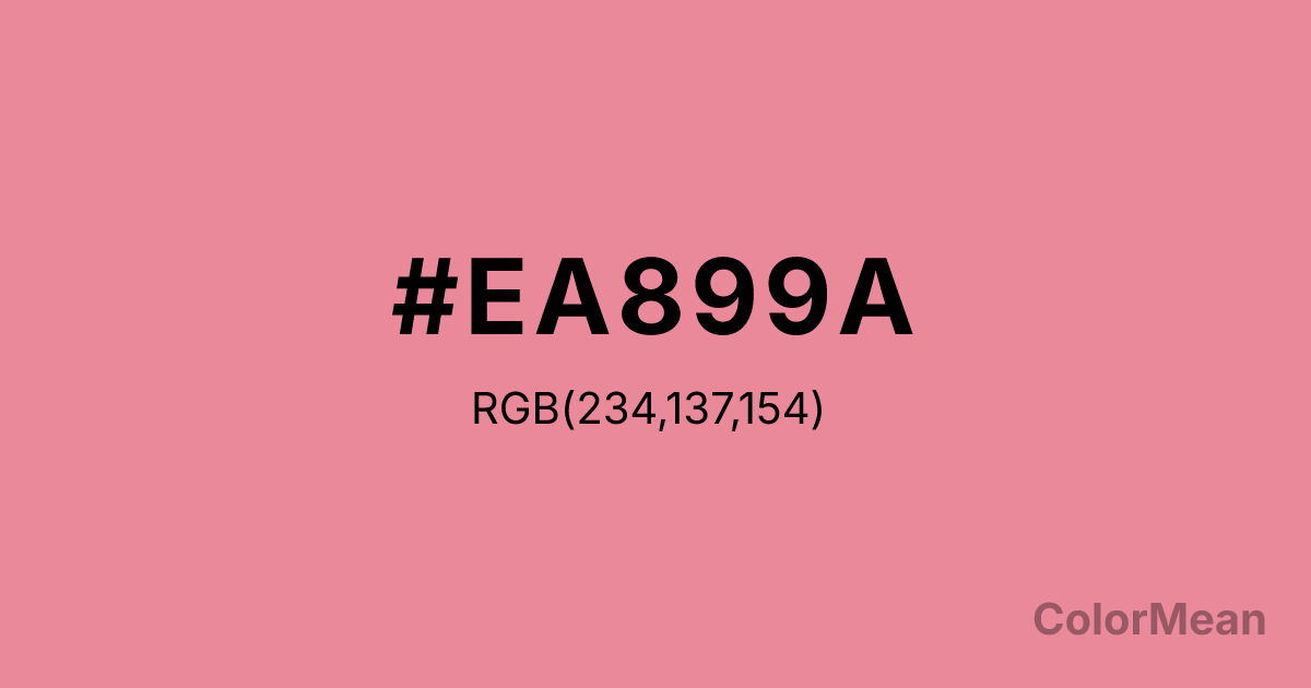 Light Pink (#EA899A) RGB value is (234, 137, 154). The hex color red value is 234, green is 137, and blue is 154. Its HSL format shows a hue of 349°, saturation of 70 percent, and lightness of 73 percent. The CMYK process values are 0 percent, 41 percent, 34 percent, 8 percent.