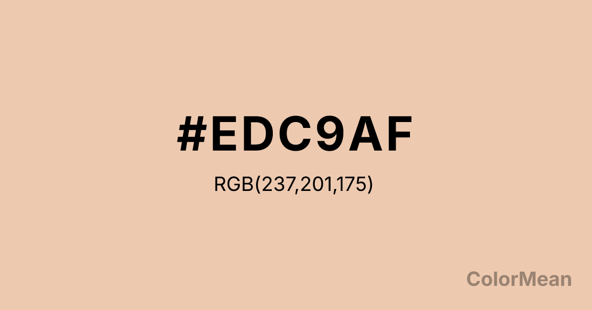 Desert Sand (#EDC9AF) RGB value is (237, 201, 175). The hex color red value is 237, green is 201, and blue is 175. Its HSL format shows a hue of 25°, saturation of 63 percent, and lightness of 81 percent. The CMYK process values are 0 percent, 15 percent, 26 percent, 7 percent.