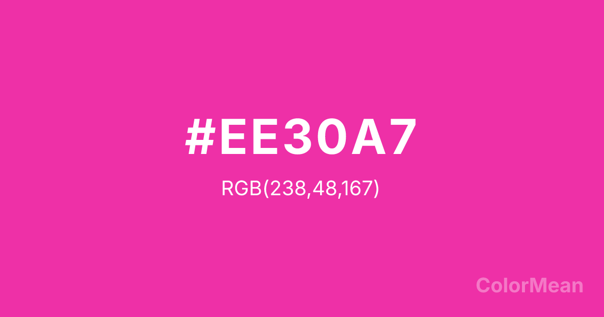 Maroon2 (#EE30A7) RGB value is (238, 48, 167). The hex color red value is 238, green is 48, and blue is 167. Its HSL format shows a hue of 322°, saturation of 85 percent, and lightness of 56 percent. The CMYK process values are 0 percent, 80 percent, 30 percent, 7 percent.