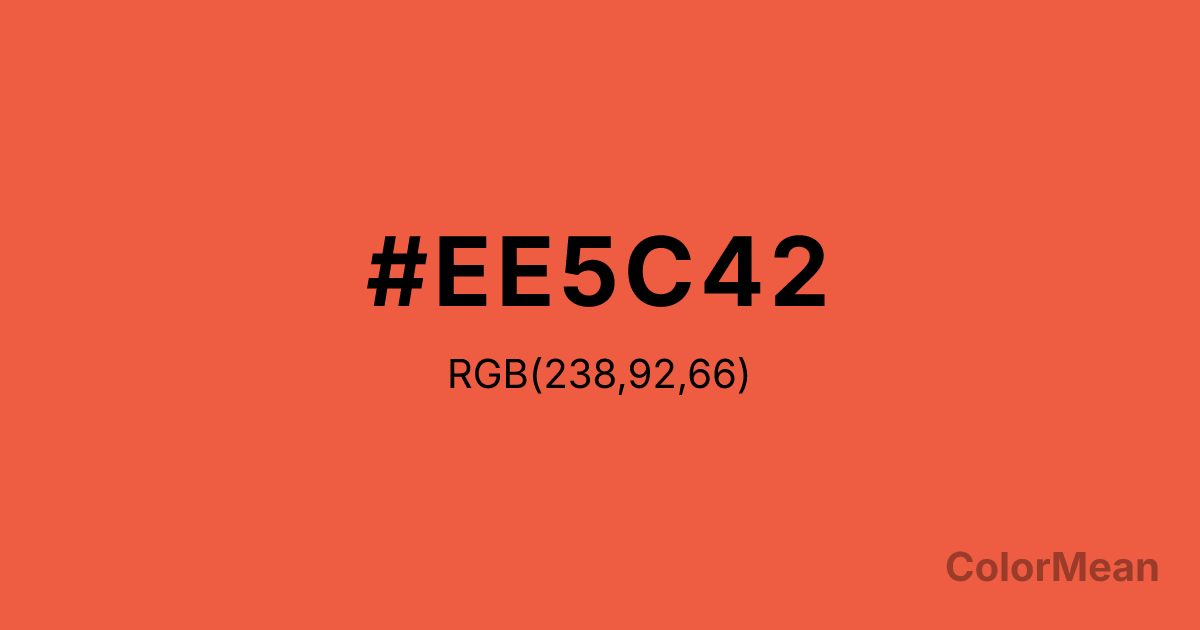 Tomato 2 (#EE5C42) RGB value is (238, 92, 66). The hex color red value is 238, green is 92, and blue is 66. Its HSL format shows a hue of 9°, saturation of 83 percent, and lightness of 60 percent. The CMYK process values are 0 percent, 61 percent, 72 percent, 7 percent.