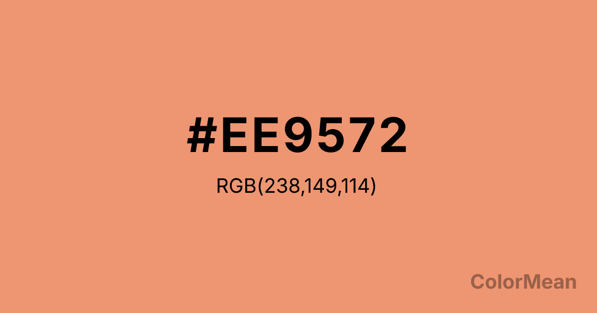LightSalmon2 (#EE9572) RGB value is (238, 149, 114). The hex color red value is 238, green is 149, and blue is 114. Its HSL format shows a hue of 17°, saturation of 78 percent, and lightness of 69 percent. The CMYK process values are 0 percent, 37 percent, 52 percent, 7 percent.