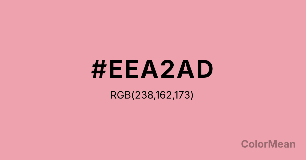 LightPink2 (#EEA2AD) RGB value is (238, 162, 173). The hex color red value is 238, green is 162, and blue is 173. Its HSL format shows a hue of 351°, saturation of 69 percent, and lightness of 78 percent. The CMYK process values are 0 percent, 32 percent, 27 percent, 7 percent.