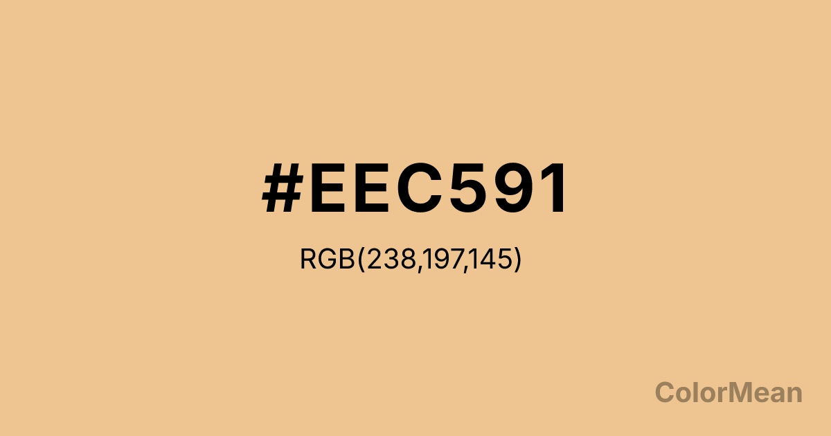 Burlywood2 (#EEC591) RGB value is (238, 197, 145). The hex color red value is 238, green is 197, and blue is 145. Its HSL format shows a hue of 34°, saturation of 73 percent, and lightness of 75 percent. The CMYK process values are 0 percent, 17 percent, 39 percent, 7 percent.