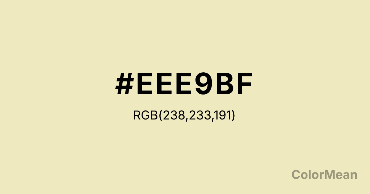 LemonChiffon2 (#EEE9BF) RGB value is (238, 233, 191). The hex color red value is 238, green is 233, and blue is 191. Its HSL format shows a hue of 54°, saturation of 58 percent, and lightness of 84 percent. The CMYK process values are 0 percent, 2 percent, 20 percent, 7 percent.