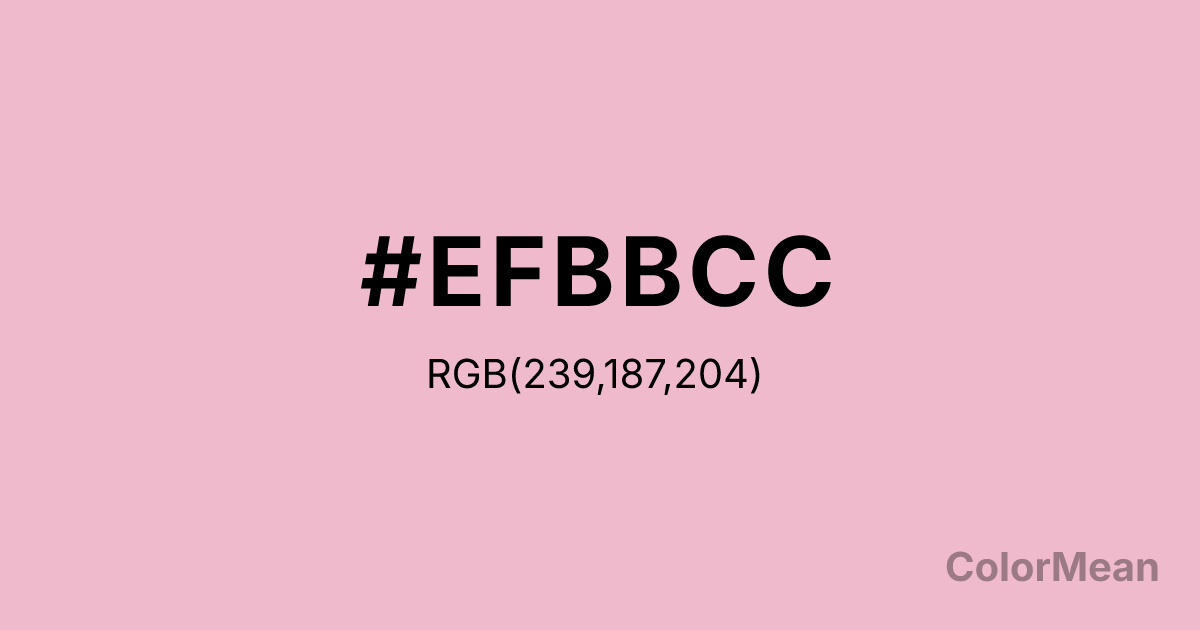Cameo Pink (#EFBBCC) RGB value is (239, 187, 204). The hex color red value is 239, green is 187, and blue is 204. Its HSL format shows a hue of 340°, saturation of 62 percent, and lightness of 84 percent. The CMYK process values are 0 percent, 22 percent, 15 percent, 6 percent.