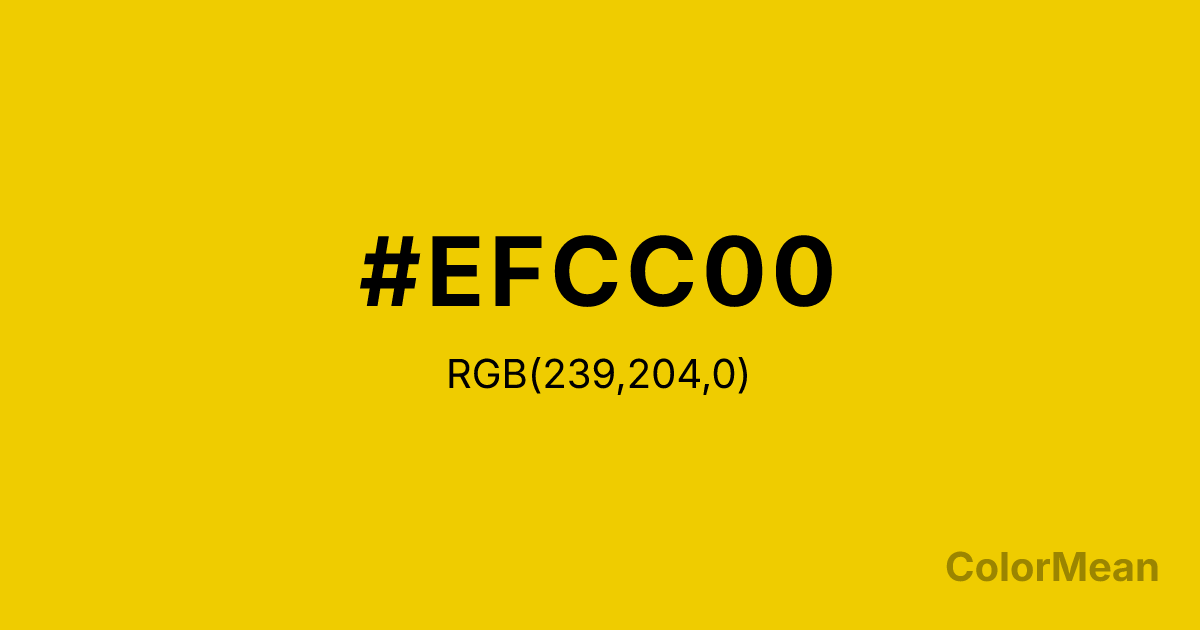Yellow (Munsell) (#EFCC00) RGB value is (239, 204, 0). The hex color red value is 239, green is 204, and blue is 0. Its HSL format shows a hue of 51°, saturation of 100 percent, and lightness of 47 percent. The CMYK process values are 0 percent, 15 percent, 100 percent, 6 percent.