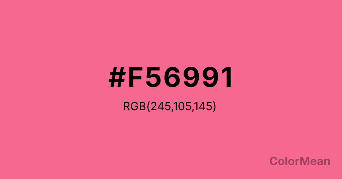 Light Crimson (#F56991) RGB value is (245, 105, 145). The hex color red value is 245, green is 105, and blue is 145. Its HSL format shows a hue of 343°, saturation of 88 percent, and lightness of 69 percent. The CMYK process values are 0 percent, 57 percent, 41 percent, 4 percent.