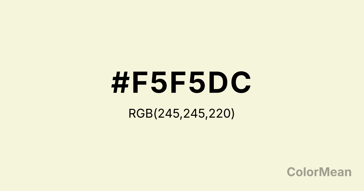 Beige (#F5F5DC) RGB value is (245, 245, 220). The hex color red value is 245, green is 245, and blue is 220. Its HSL format shows a hue of 60°, saturation of 56 percent, and lightness of 91 percent. The CMYK process values are 0 percent, 0 percent, 10 percent, 4 percent.