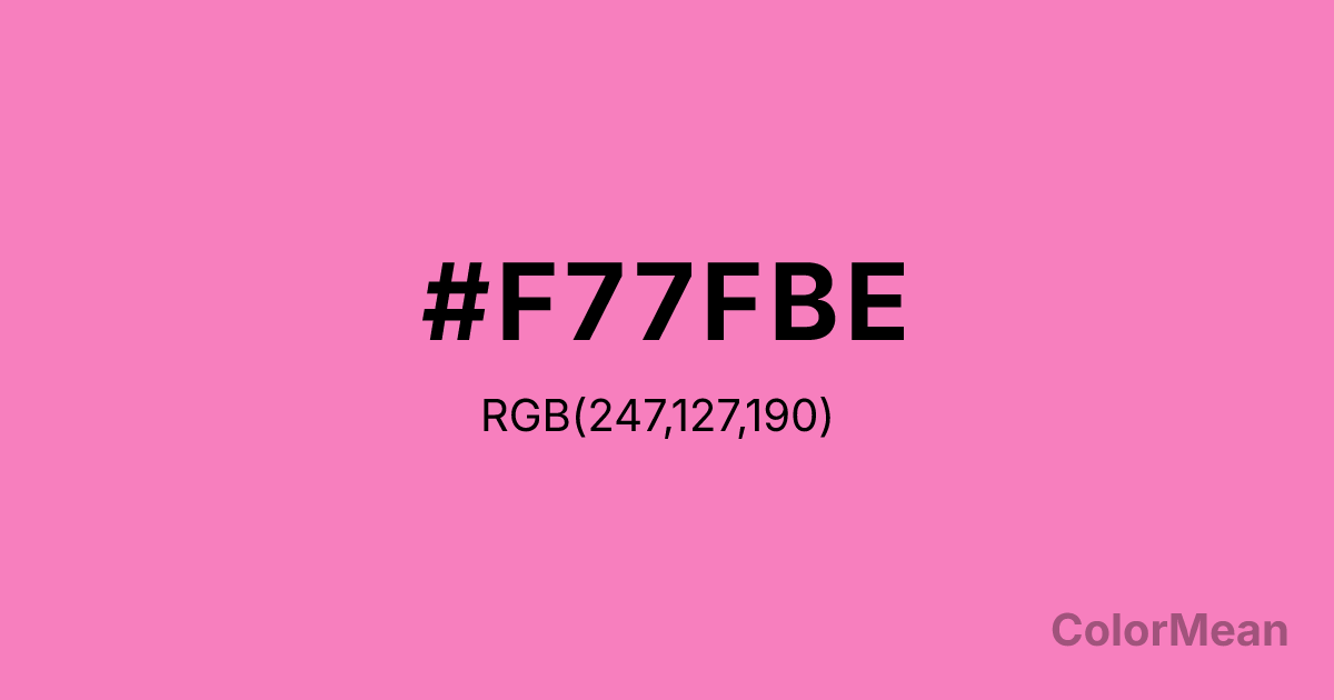 Persian Pink (#F77FBE) RGB value is (247, 127, 190). The hex color red value is 247, green is 127, and blue is 190. Its HSL format shows a hue of 329°, saturation of 88 percent, and lightness of 73 percent. The CMYK process values are 0 percent, 49 percent, 23 percent, 3 percent.