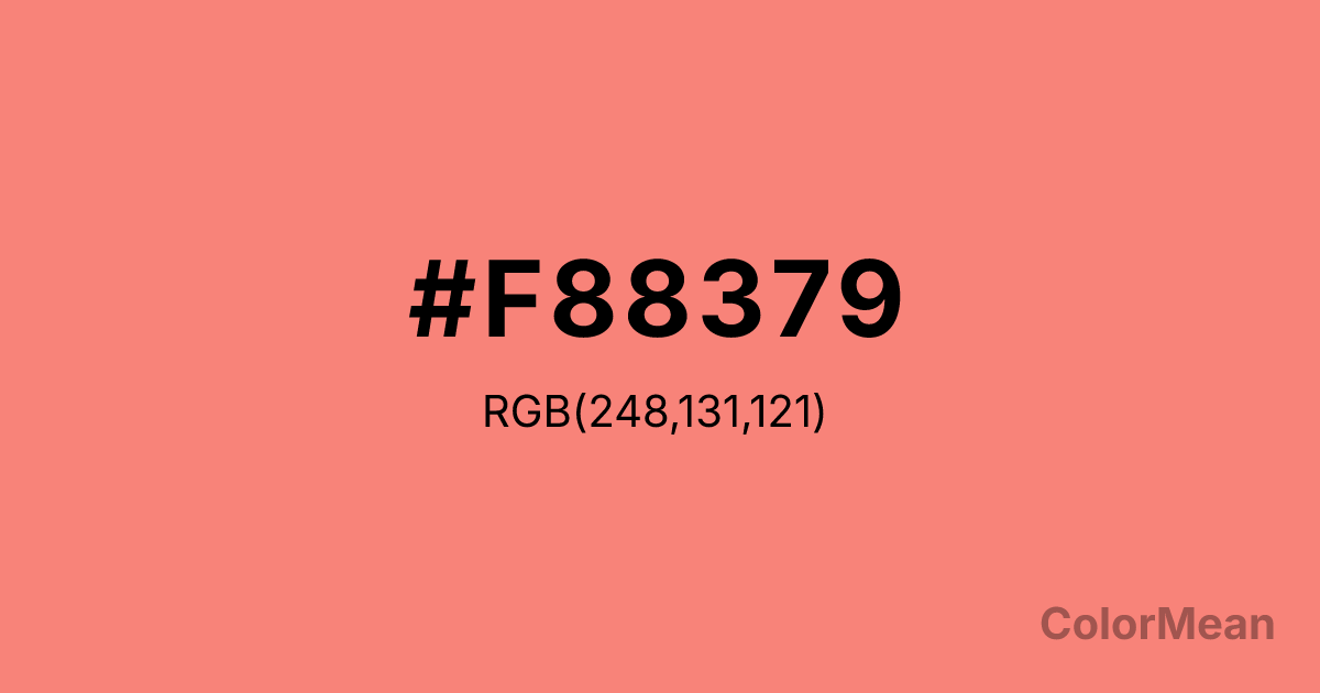 Tea Rose (#F88379) RGB value is (248, 131, 121). The hex color red value is 248, green is 131, and blue is 121. Its HSL format shows a hue of 5°, saturation of 90 percent, and lightness of 72 percent. The CMYK process values are 0 percent, 47 percent, 51 percent, 3 percent.