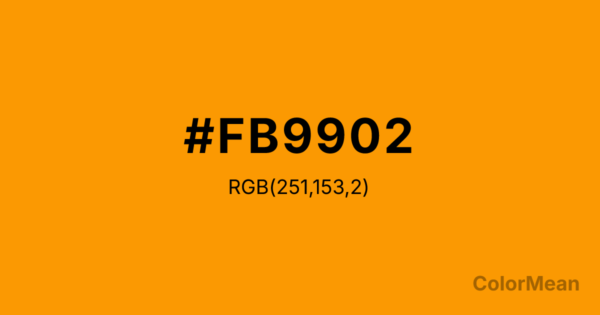 Orange (RYB) (#FB9902) RGB value is (251, 153, 2). The hex color red value is 251, green is 153, and blue is 2. Its HSL format shows a hue of 36°, saturation of 98 percent, and lightness of 50 percent. The CMYK process values are 0 percent, 39 percent, 99 percent, 2 percent.