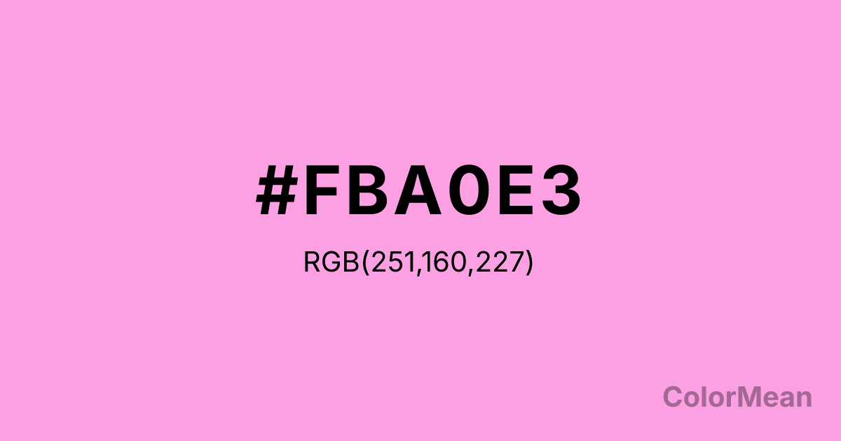Lavender Rose (#FBA0E3) RGB value is (251, 160, 227). The hex color red value is 251, green is 160, and blue is 227. Its HSL format shows a hue of 316°, saturation of 92 percent, and lightness of 81 percent. The CMYK process values are 0 percent, 36 percent, 10 percent, 2 percent.