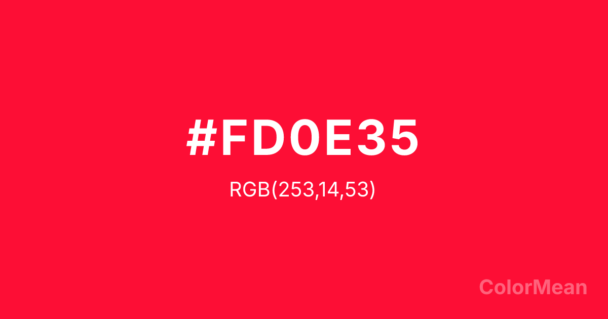 Tractor Red (#FD0E35) RGB value is (253, 14, 53). The hex color red value is 253, green is 14, and blue is 53. Its HSL format shows a hue of 350°, saturation of 98 percent, and lightness of 52 percent. The CMYK process values are 0 percent, 94 percent, 79 percent, 1 percent.