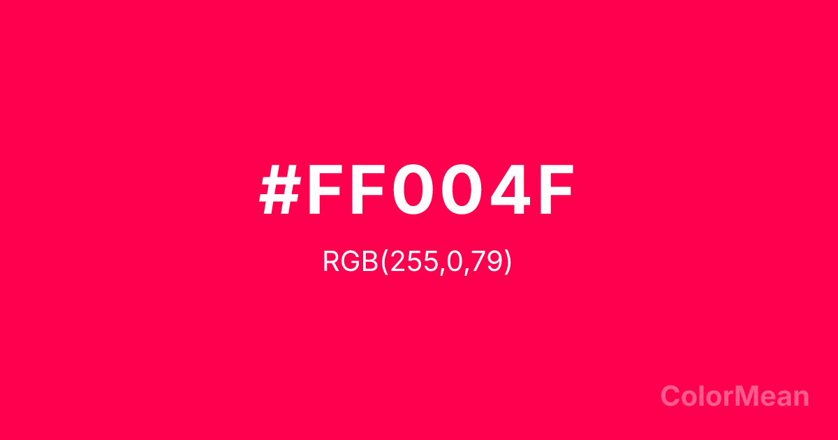Folly (#FF004F) RGB value is (255, 0, 79). The hex color red value is 255, green is 0, and blue is 79. Its HSL format shows a hue of 341°, saturation of 100 percent, and lightness of 50 percent. The CMYK process values are 0 percent, 100 percent, 69 percent, 0 percent.