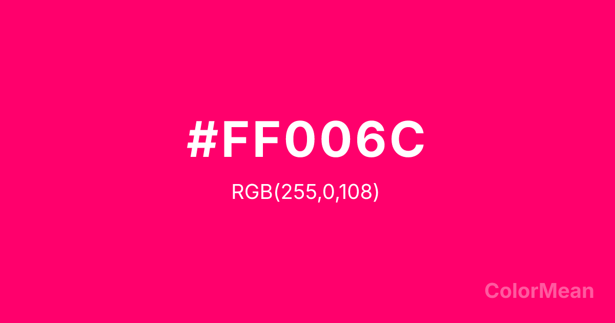 Vivid Raspberry (#FF006C) RGB value is (255, 0, 108). The hex color red value is 255, green is 0, and blue is 108. Its HSL format shows a hue of 335°, saturation of 100 percent, and lightness of 50 percent. The CMYK process values are 0 percent, 100 percent, 58 percent, 0 percent.