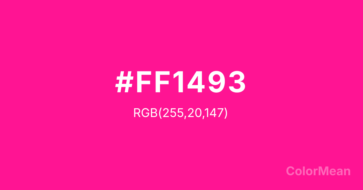 Fluorescent Pink (#FF1493) RGB value is (255, 20, 147). The hex color red value is 255, green is 20, and blue is 147. Its HSL format shows a hue of 328°, saturation of 100 percent, and lightness of 54 percent. The CMYK process values are 0 percent, 92 percent, 42 percent, 0 percent.