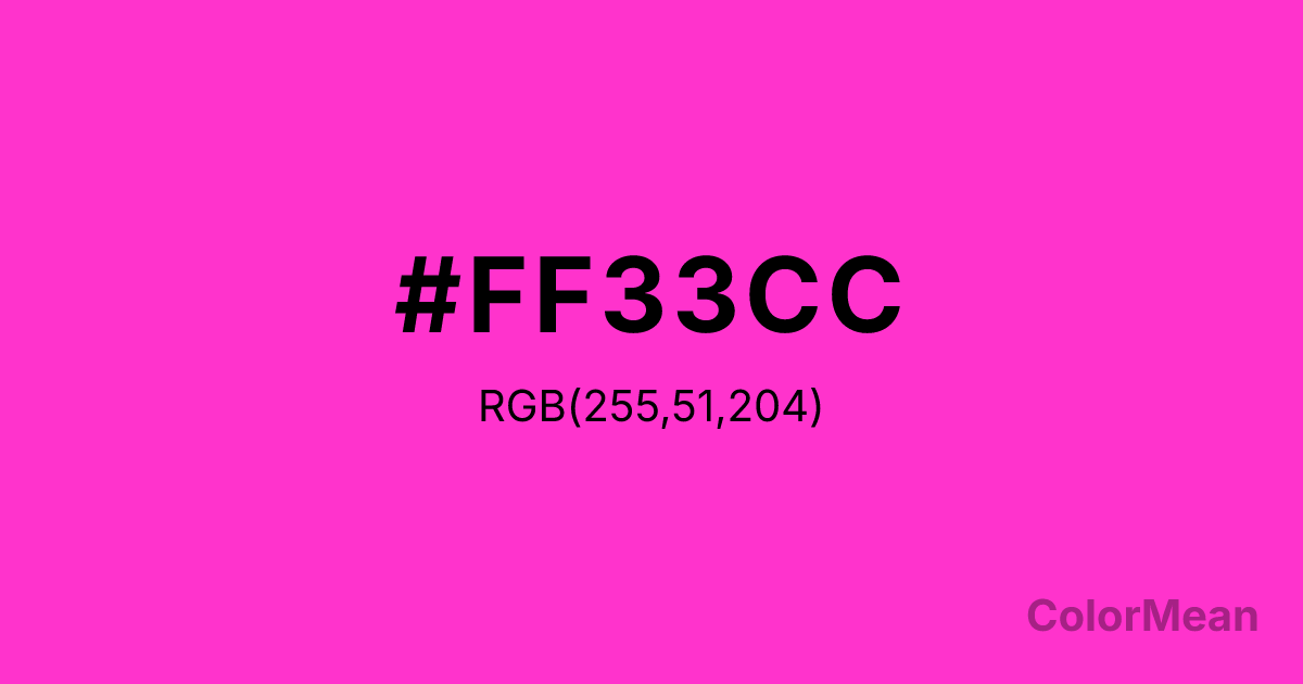 Razzle Dazzle Rose (#FF33CC) RGB value is (255, 51, 204). The hex color red value is 255, green is 51, and blue is 204. Its HSL format shows a hue of 315°, saturation of 100 percent, and lightness of 60 percent. The CMYK process values are 0 percent, 80 percent, 20 percent, 0 percent.
