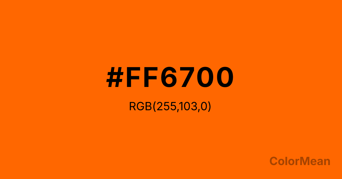 Safety Orange (#FF6700) RGB value is (255, 103, 0). The hex color red value is 255, green is 103, and blue is 0. Its HSL format shows a hue of 24°, saturation of 100 percent, and lightness of 50 percent. The CMYK process values are 0 percent, 60 percent, 100 percent, 0 percent.