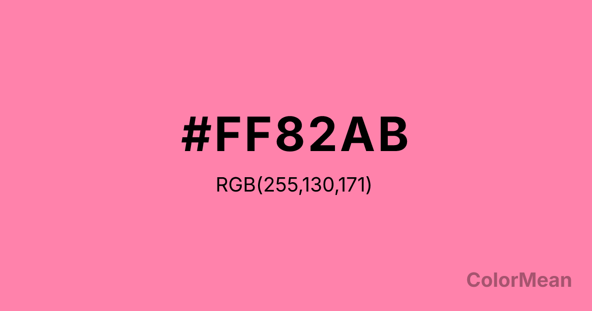 Pale Violet Red 1 (#FF82AB) RGB value is (255, 130, 171). The hex color red value is 255, green is 130, and blue is 171. Its HSL format shows a hue of 340°, saturation of 100 percent, and lightness of 75 percent. The CMYK process values are 0 percent, 49 percent, 33 percent, 0 percent.