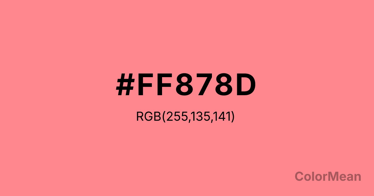 Tulip (#FF878D) RGB value is (255, 135, 141). The hex color red value is 255, green is 135, and blue is 141. Its HSL format shows a hue of 357°, saturation of 100 percent, and lightness of 76 percent. The CMYK process values are 0 percent, 47 percent, 45 percent, 0 percent.