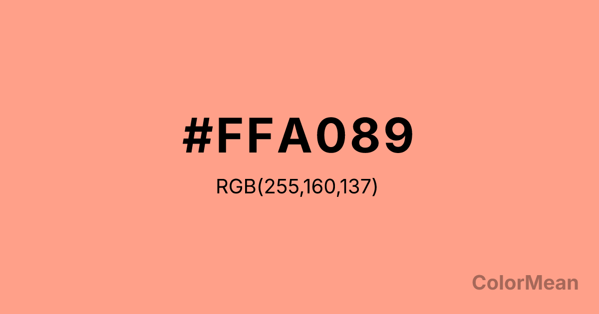 Vivid Tangerine (#FFA089) RGB value is (255, 160, 137). The hex color red value is 255, green is 160, and blue is 137. Its HSL format shows a hue of 12°, saturation of 100 percent, and lightness of 77 percent. The CMYK process values are 0 percent, 37 percent, 46 percent, 0 percent.