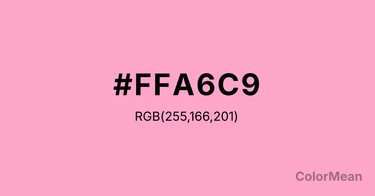 Carnation Pink (#FFA6C9) RGB value is (255, 166, 201). The hex color red value is 255, green is 166, and blue is 201. Its HSL format shows a hue of 336°, saturation of 100 percent, and lightness of 83 percent. The CMYK process values are 0 percent, 35 percent, 21 percent, 0 percent.