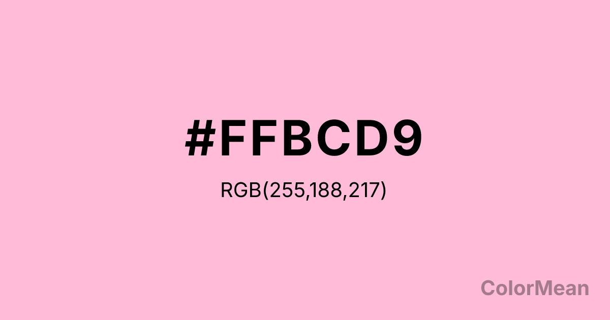 Cotton Candy (#FFBCD9) RGB value is (255, 188, 217). The hex color red value is 255, green is 188, and blue is 217. Its HSL format shows a hue of 334°, saturation of 100 percent, and lightness of 87 percent. The CMYK process values are 0 percent, 26 percent, 15 percent, 0 percent.