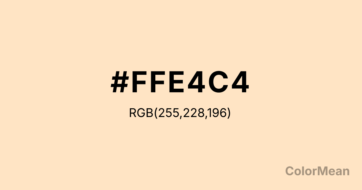 Bisque (#FFE4C4) RGB value is (255, 228, 196). The hex color red value is 255, green is 228, and blue is 196. Its HSL format shows a hue of 33°, saturation of 100 percent, and lightness of 88 percent. The CMYK process values are 0 percent, 11 percent, 23 percent, 0 percent.