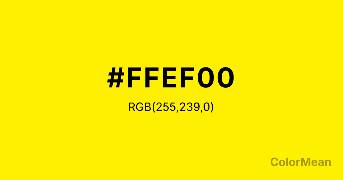 Yellow (process) (#FFEF00) RGB value is (255, 239, 0). The hex color red value is 255, green is 239, and blue is 0. Its HSL format shows a hue of 56°, saturation of 100 percent, and lightness of 50 percent. The CMYK process values are 0 percent, 6 percent, 100 percent, 0 percent.