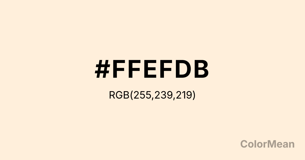 AntiqueWhite1 (#FFEFDB) RGB value is (255, 239, 219). The hex color red value is 255, green is 239, and blue is 219. Its HSL format shows a hue of 33°, saturation of 100 percent, and lightness of 93 percent. The CMYK process values are 0 percent, 6 percent, 14 percent, 0 percent.