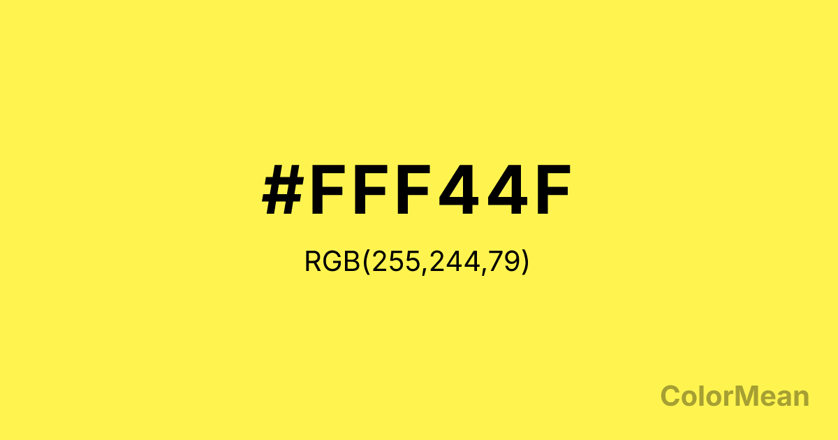 Lemon Yellow (#FFF44F) (#FFF44F) RGB value is (255, 244, 79). The hex color red value is 255, green is 244, and blue is 79. Its HSL format shows a hue of 56°, saturation of 100 percent, and lightness of 65 percent. The CMYK process values are 0 percent, 4 percent, 69 percent, 0 percent.