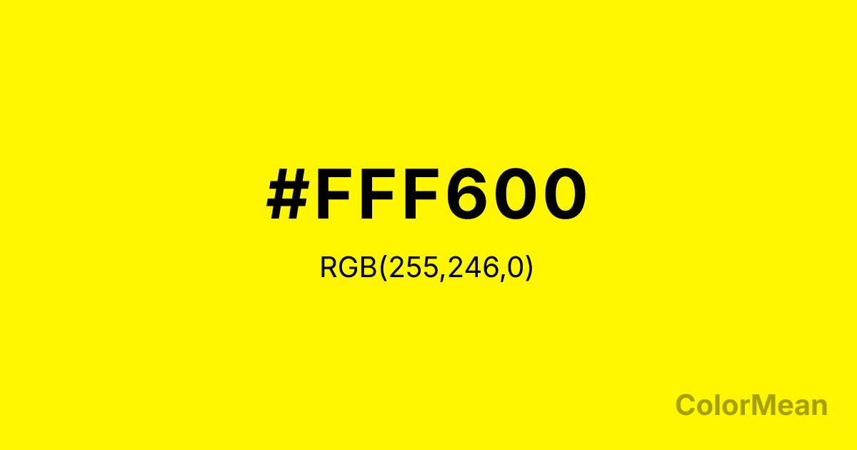Cadmium Yellow (#FFF600) RGB value is (255, 246, 0). The hex color red value is 255, green is 246, and blue is 0. Its HSL format shows a hue of 58°, saturation of 100 percent, and lightness of 50 percent. The CMYK process values are 0 percent, 4 percent, 100 percent, 0 percent.