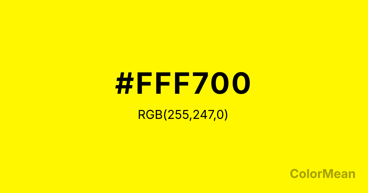 Lemon (#FFF700) RGB value is (255, 247, 0). The hex color red value is 255, green is 247, and blue is 0. Its HSL format shows a hue of 58°, saturation of 100 percent, and lightness of 50 percent. The CMYK process values are 0 percent, 3 percent, 100 percent, 0 percent.